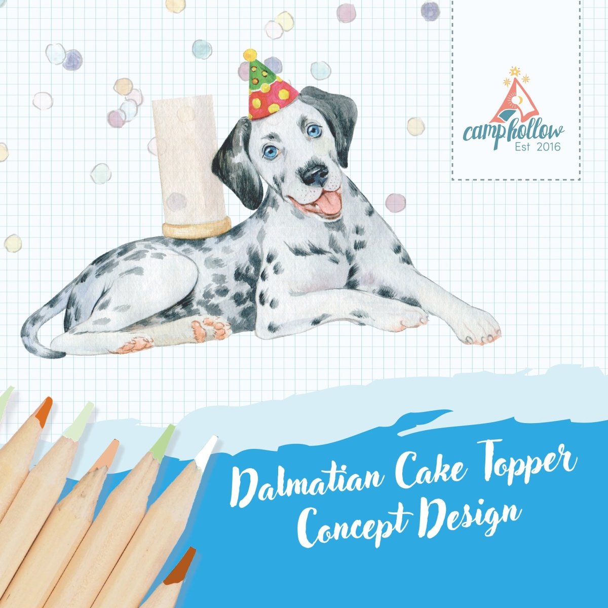 ⛺️ Designed at Camp Hollow, all our cake toppers are made to reflect the personality of the animals they portray. The Dalmatians looks up to their family with blue eyes and panting tongue, happy to fill the role of ‘party animal’! His spotty hat matches the coat, as a Dalmatian is always dressed for an occasion! 🎂✨