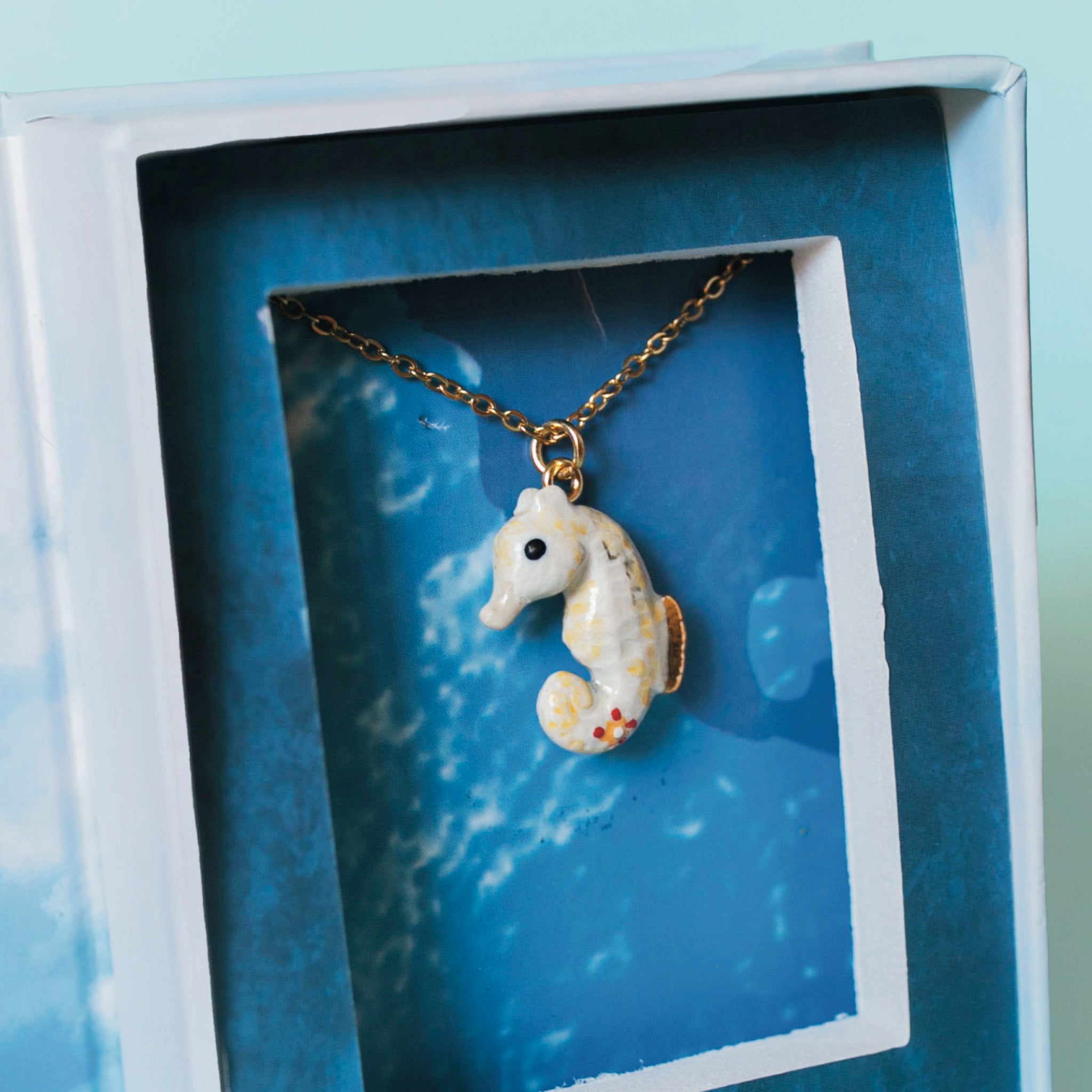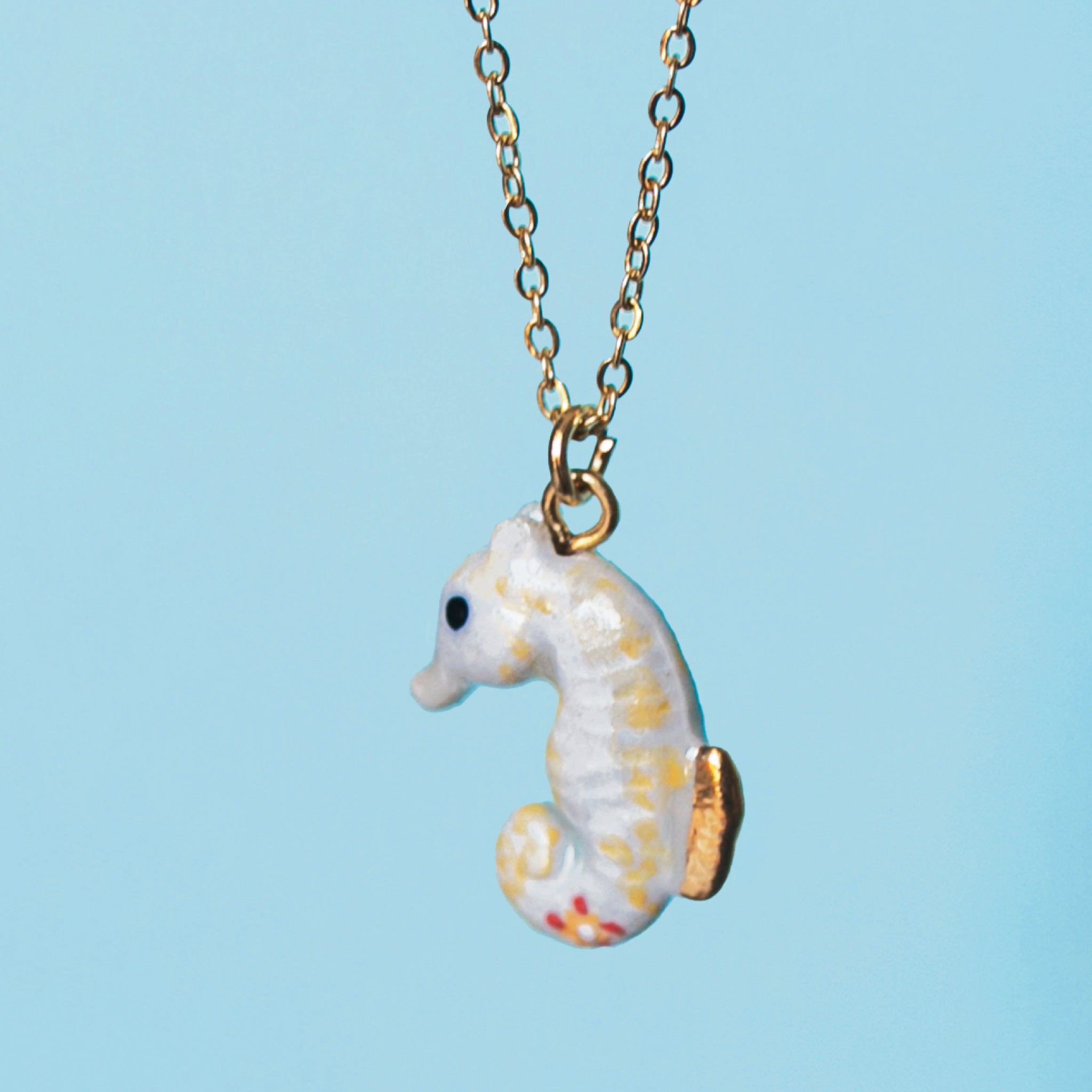 Ā š White most seahorses dwell in the temperate waters of the tropics, this special little species (found only at Camp Hollow!) prefersĀ the shocking cold of the arctic seas. Hand-painted in icy whites and blues with stunning gold details, this eccentric little porcelain dazzles on a golden chainĀ āĀ