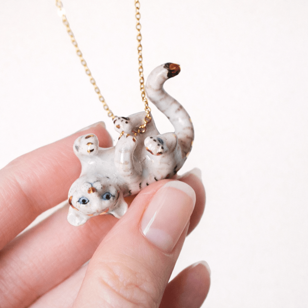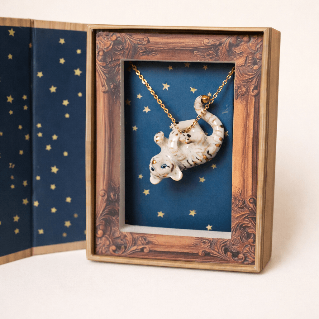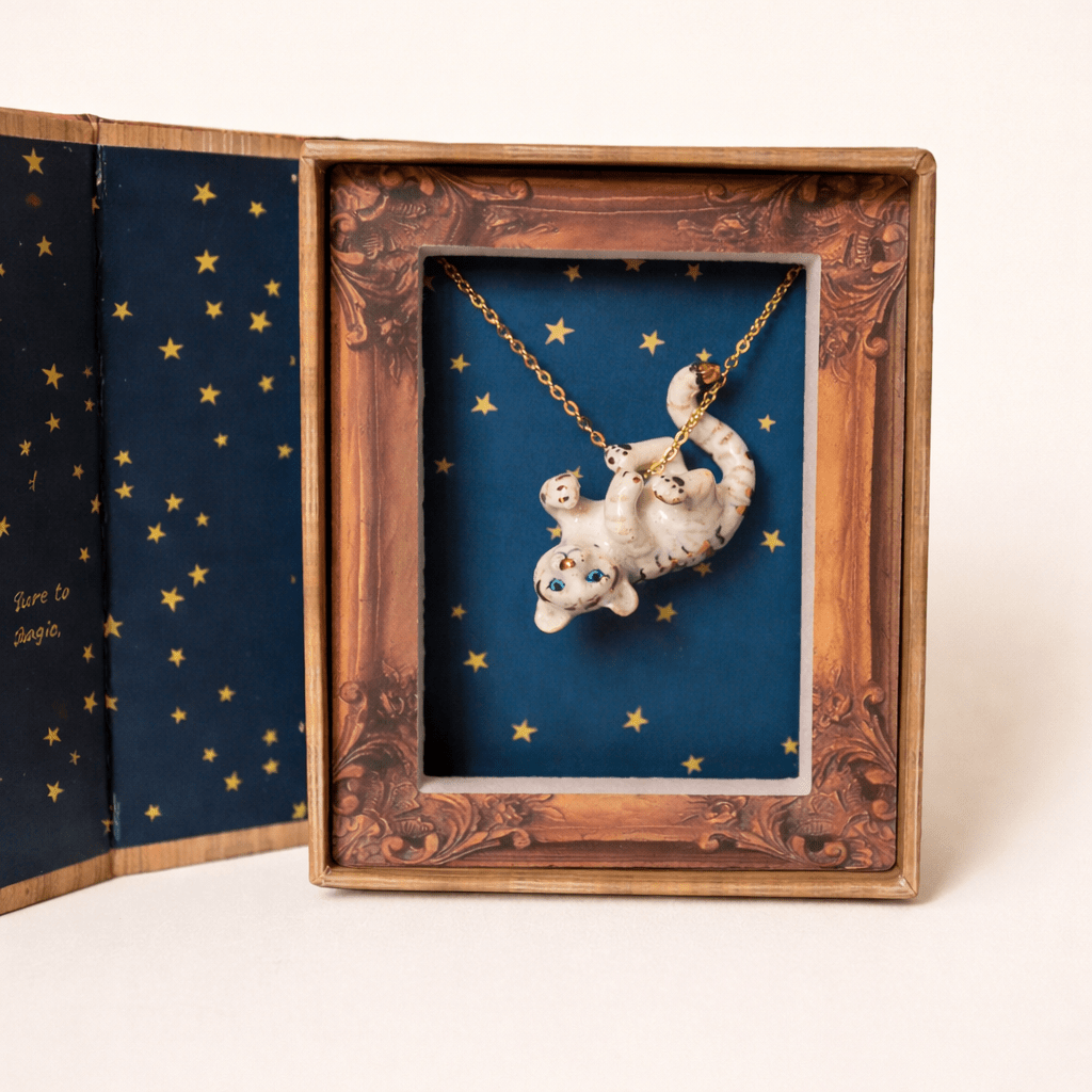 Crafted from fine porcelain, each golden white tiger pendant is meticulously hand painted with layered ivory tones, warm golden accents, and precise striping that define its striking expression. The high-gloss glaze enhances the sculpted contours while preserving the smooth integrity and durability of the material. Because every porcelain golden white tiger necklace is individually finished by hand, subtle variations ensure each piece is uniquely its own.