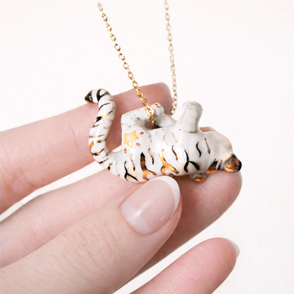 Our Golden White Tiger Necklace captures power and precision in luminous porcelain form. Sculpted with confident lines and elevated detail, this porcelain golden white tiger necklace transforms an iconic symbol of strength into a refined statement piece.
