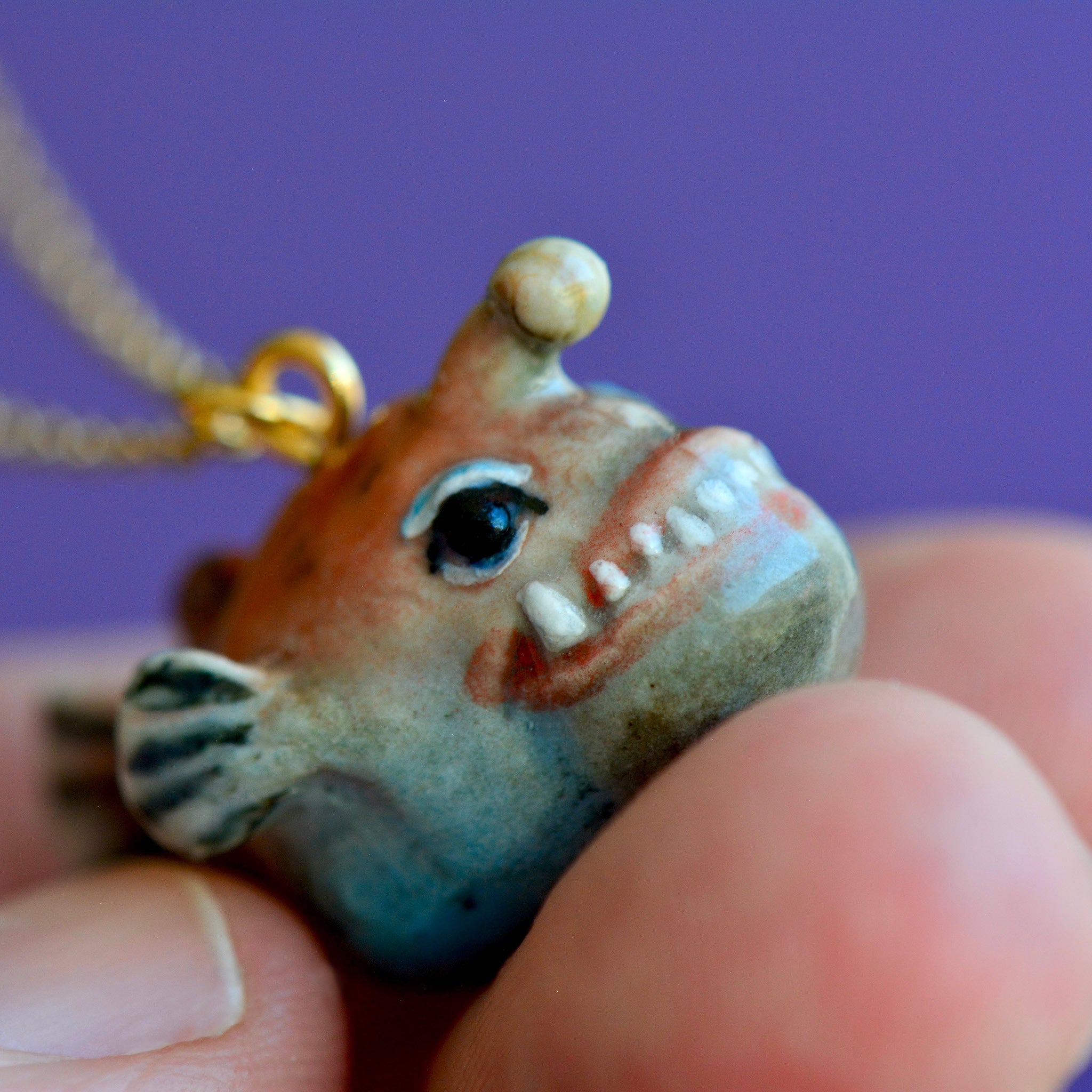 π π₯Introducing the Angler Fish necklace, a handcrafted porcelain figurine measuring approximately 1 inch tall on a delicate gold plated chain. This unique and eerie accessory captures the beauty of the deep sea creature and is versatile, perfect for dressing up or wearing casually. Lightweight and easy to clean, this necklace is a perfect gift for those who love deep sea creatures, miniature collectibles, or handmade crafts. Each piece is one-of-a-kind due to the handmade nature, and slight variations in color and design may occur.