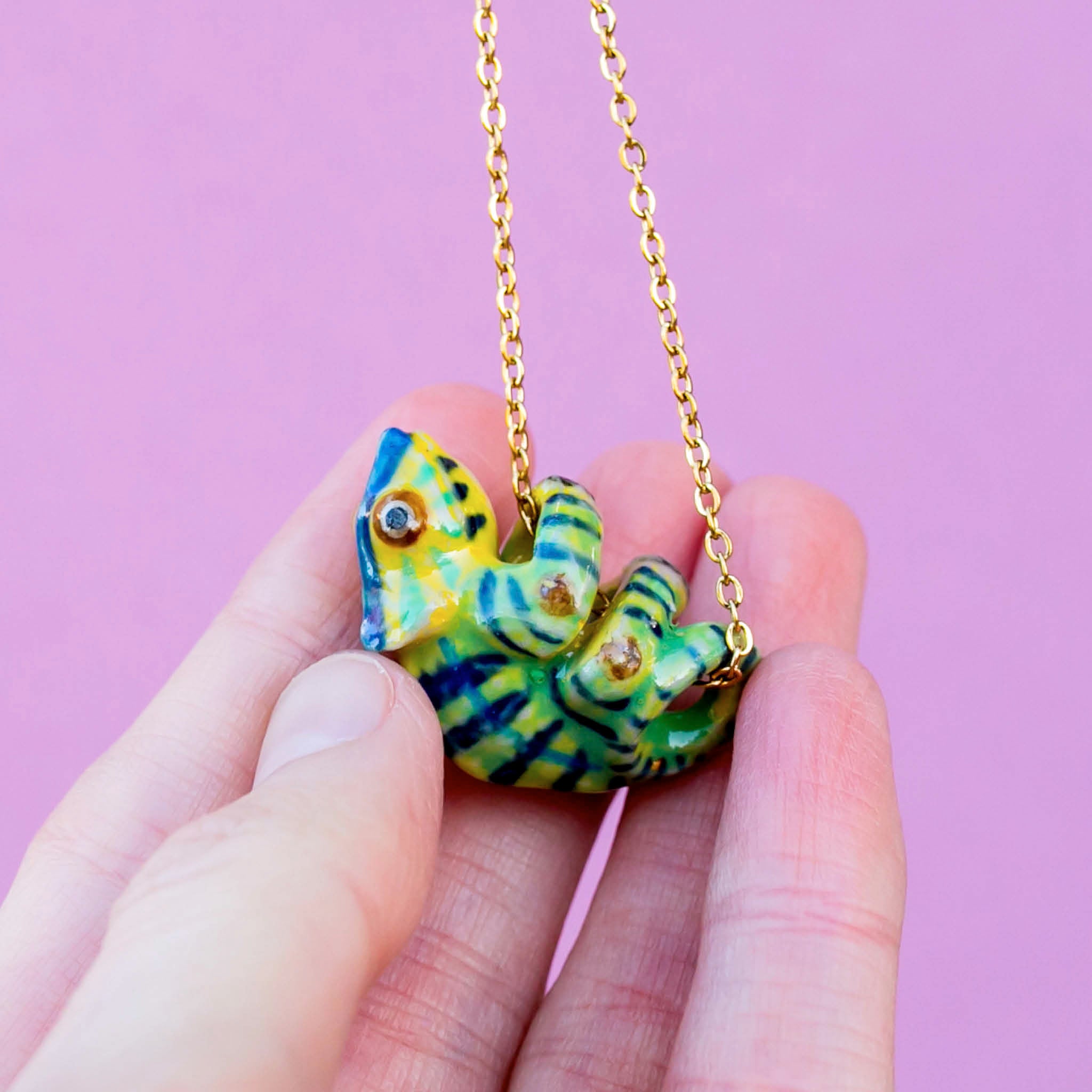 Our handcrafted chameleon necklace features a miniature porcelain chameleon figurine strung on a delicate gold plated chain, making it the perfect accessory for anyone who wants to add a touch of color to their wardrobe. The chameleon figurine is handcrafted with attention to detail, capturing the unique and mesmerizing nature of this beloved animal.