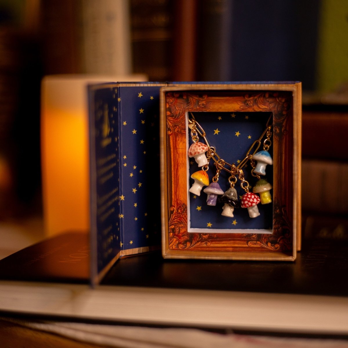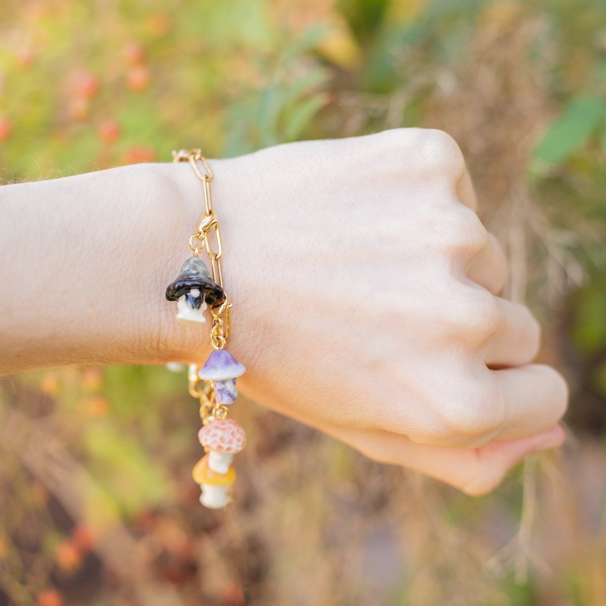 At first glance our charms may appear as mere mushrooms, but on closer inspection reveal themselves to be tiny creatures, disguised as forest fungi. They are very shy folk, and have decided to learn more about the human world by travelling on the wrist of a daydreamer!