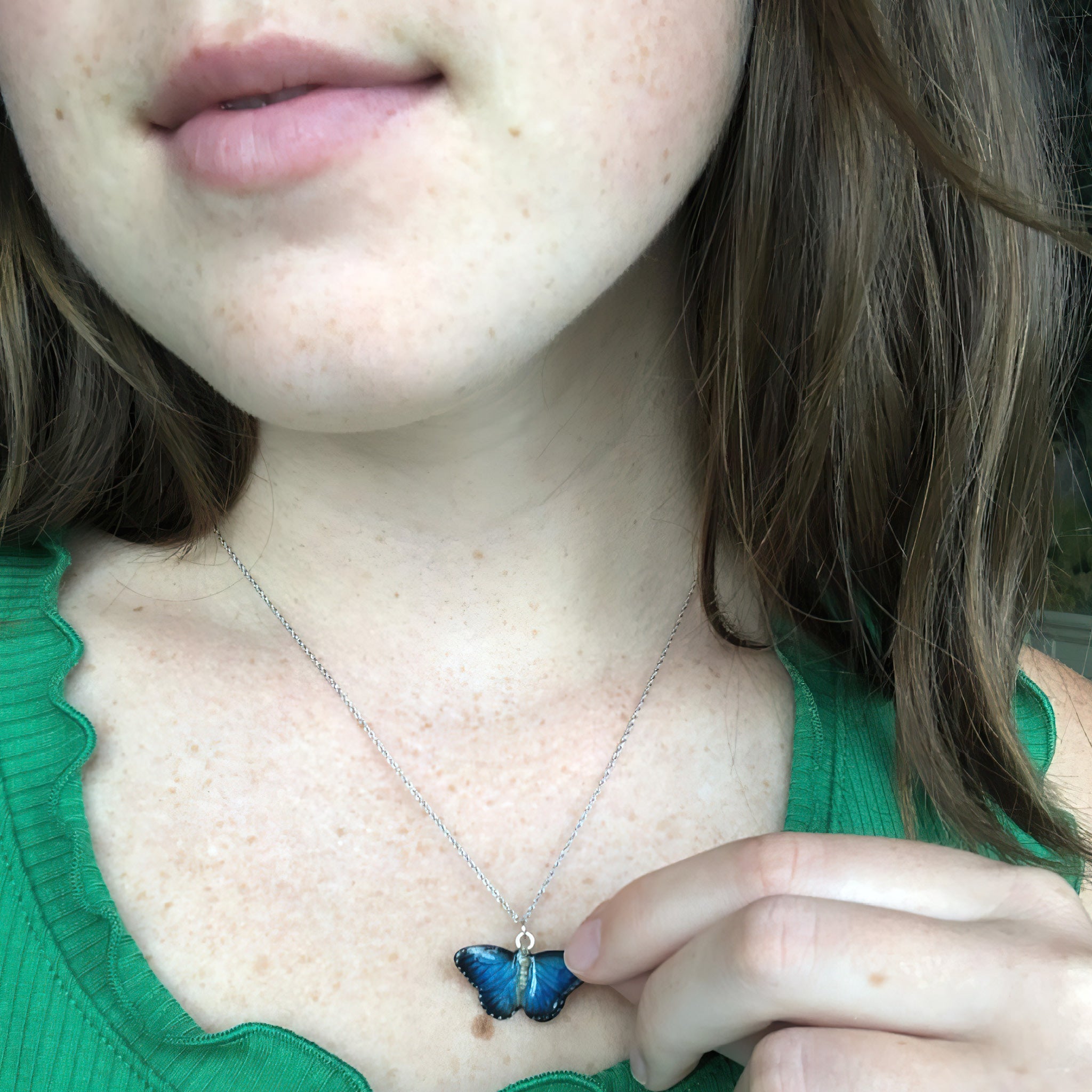 A blue butterfly to set your heart a flutter! Delicate and striking, these winged wonders symbolize birth, transformation, change, hope, and life. The Butterfly Necklace honors this beloved flyer and those who love them.