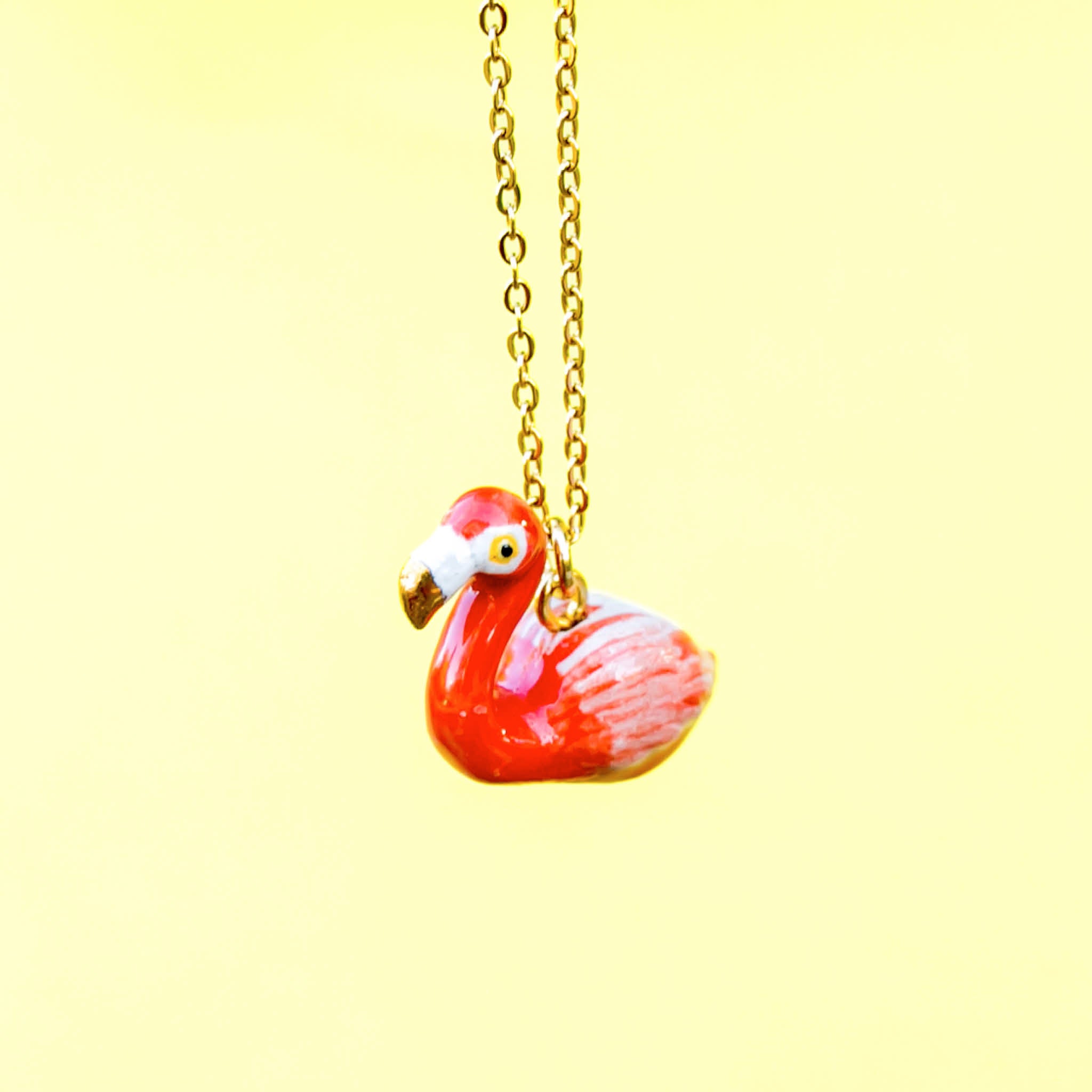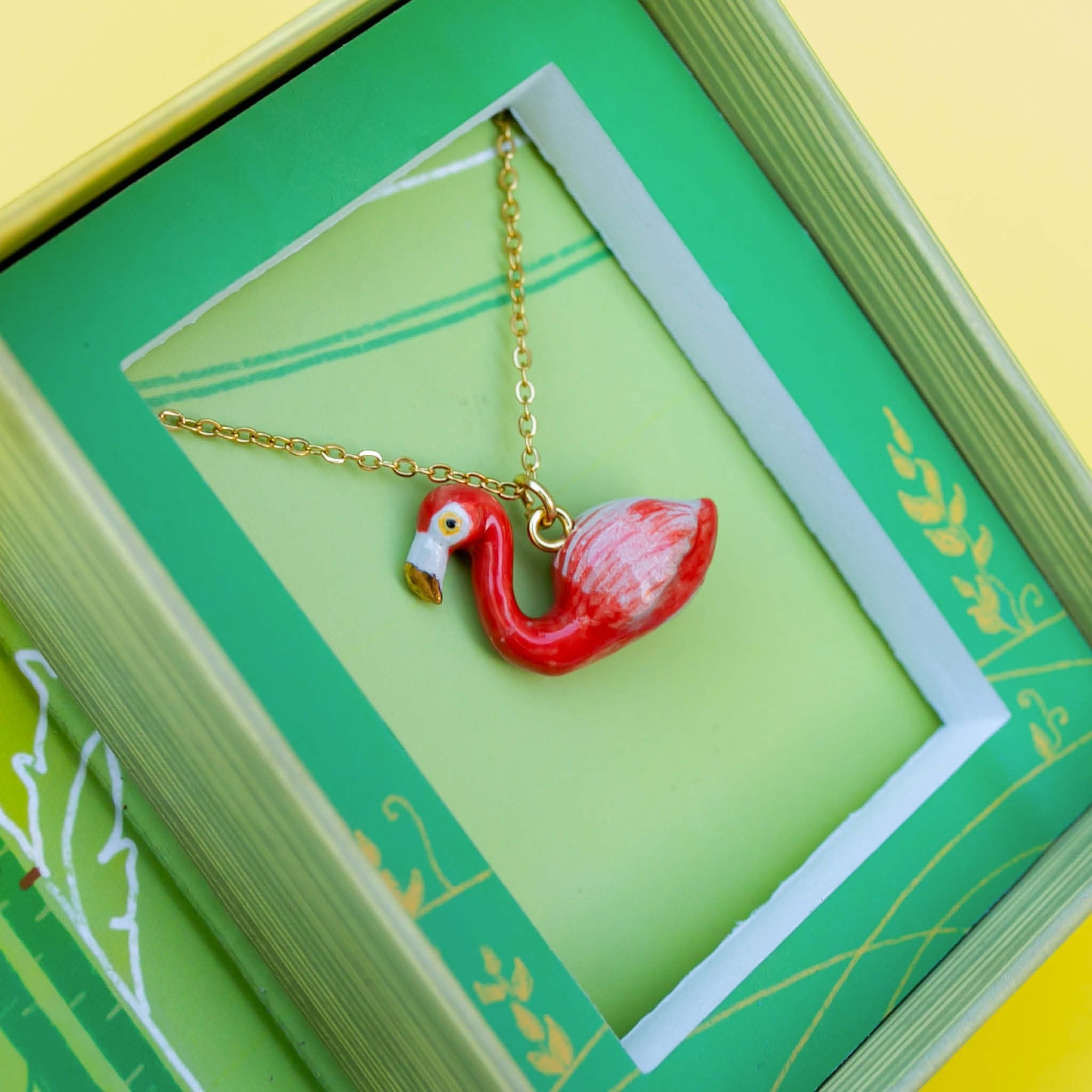 🦩 Add a pretty pop of pink to your jewelry collection with Camp Hollow’s porcelain Flamingo Necklace! In nature, these colorful creatures achieve their stunning hue by eating crustaceans packed with beta-carotene, but we achieve the look by hand-painting each piece in intricate detail, so you can really flaunt those fuchsia feathers!