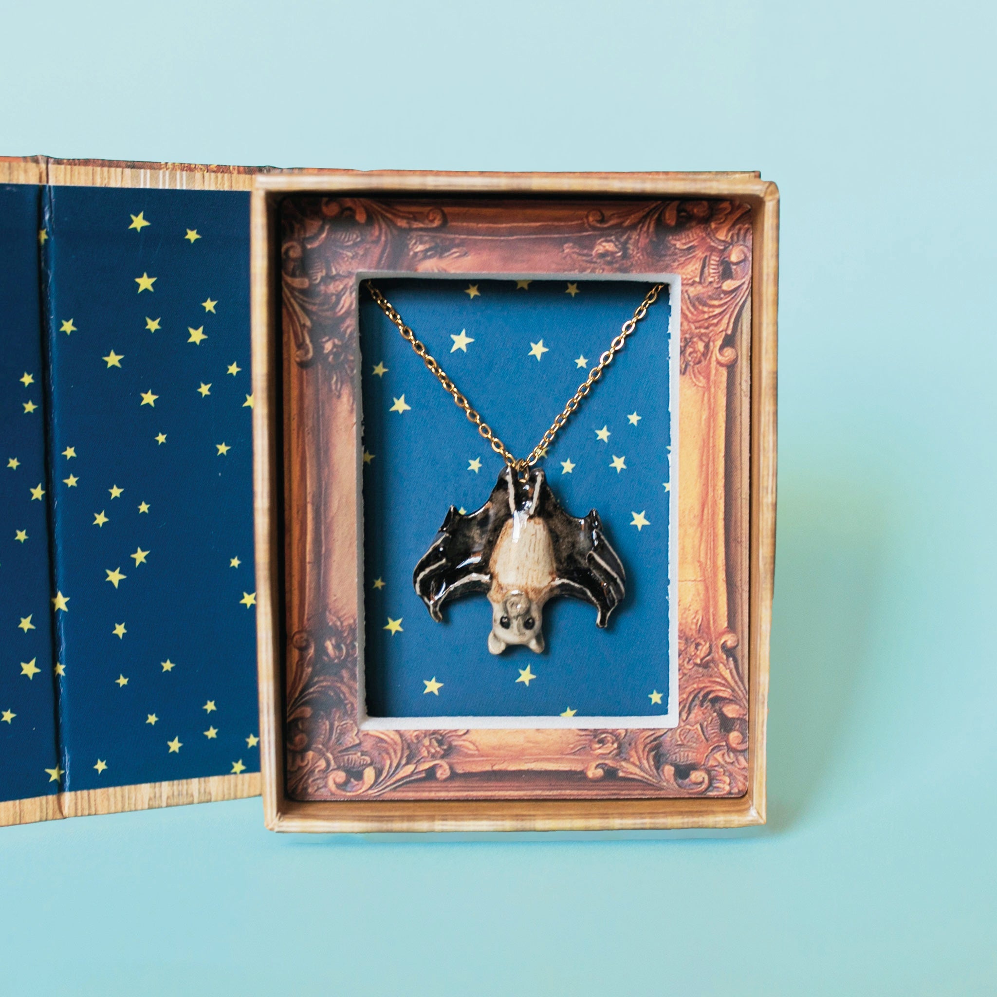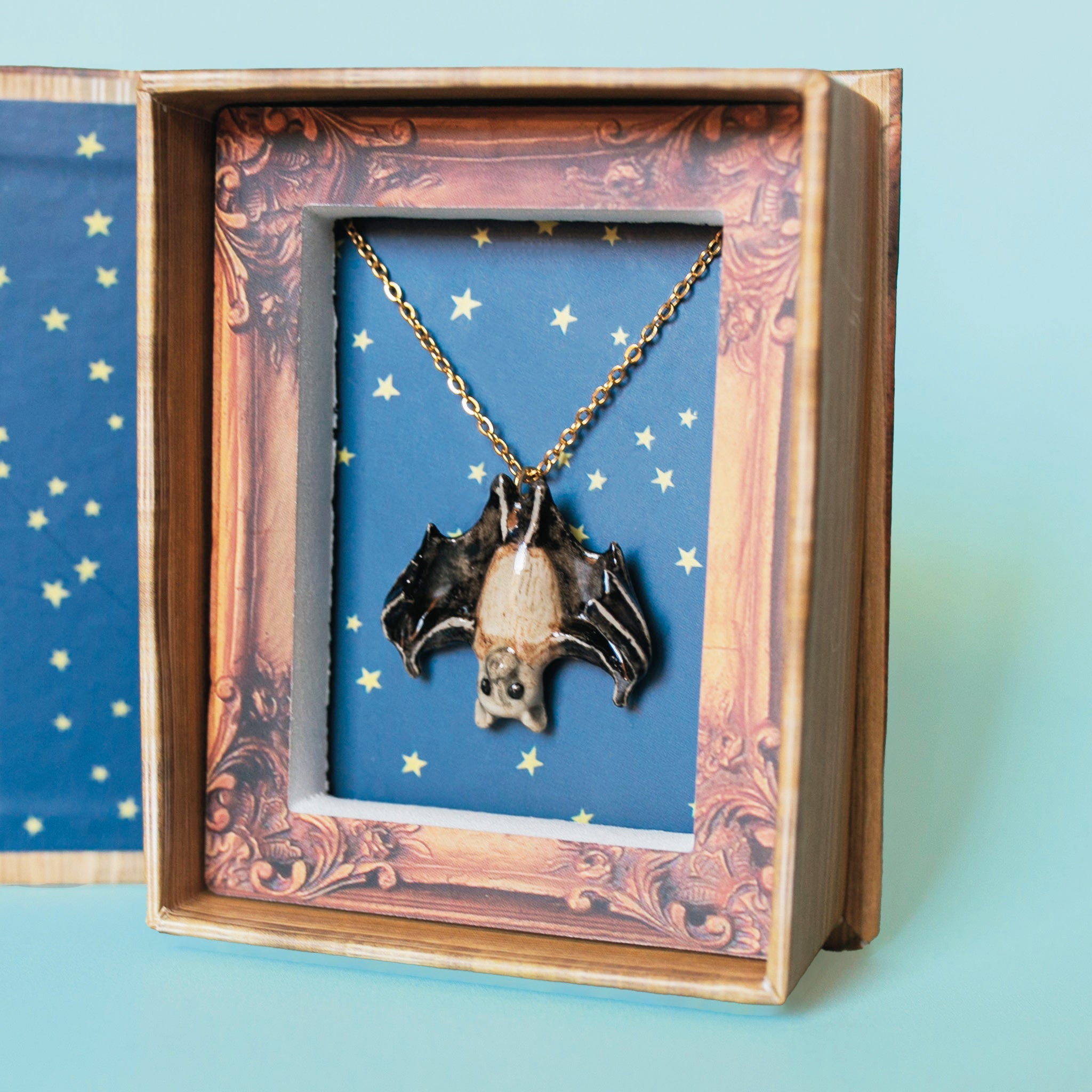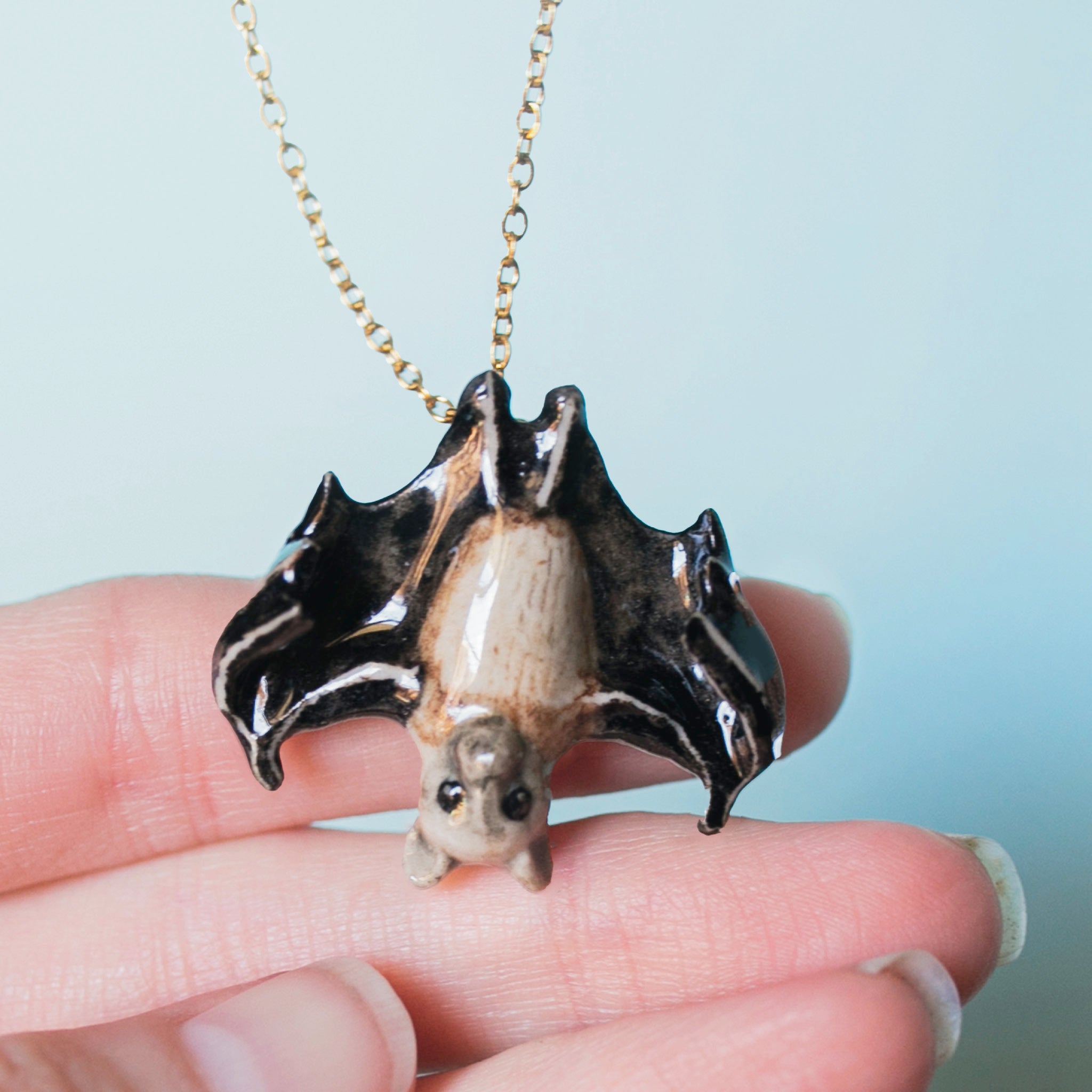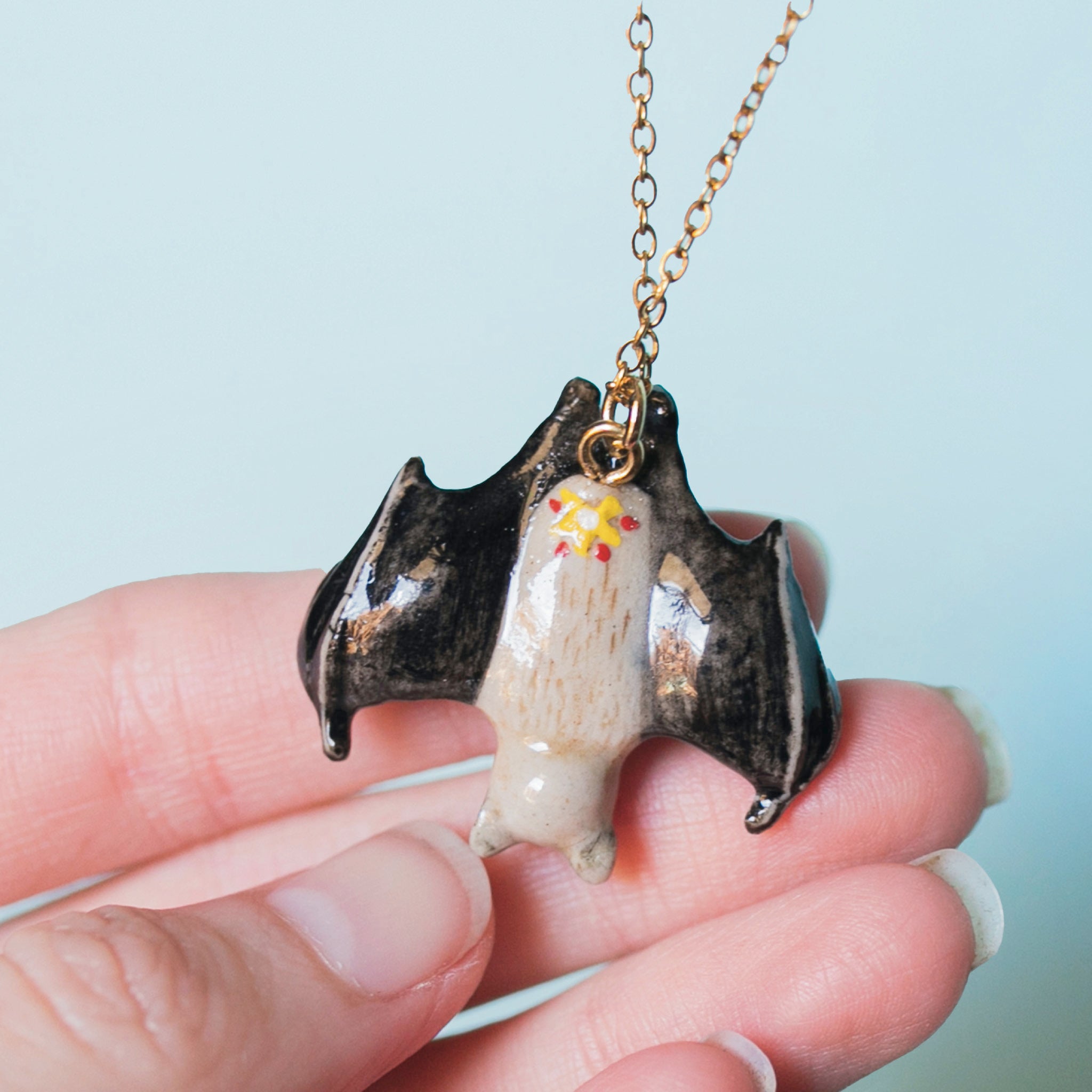🦇 Though the fruit bat is the only mammal on Earth capable of full flight, it spends most of its time hanging upside down in caves and trees. At Camp Hollow, our fruit bats prefer to hang upside down from 24 inch gold steel necklace chains! This porcelain hand-painted charm strikes a balance between spooky and cute, perfect for the Halloween-obsessive and the nature-lover alike. Nothin’ scary about that.