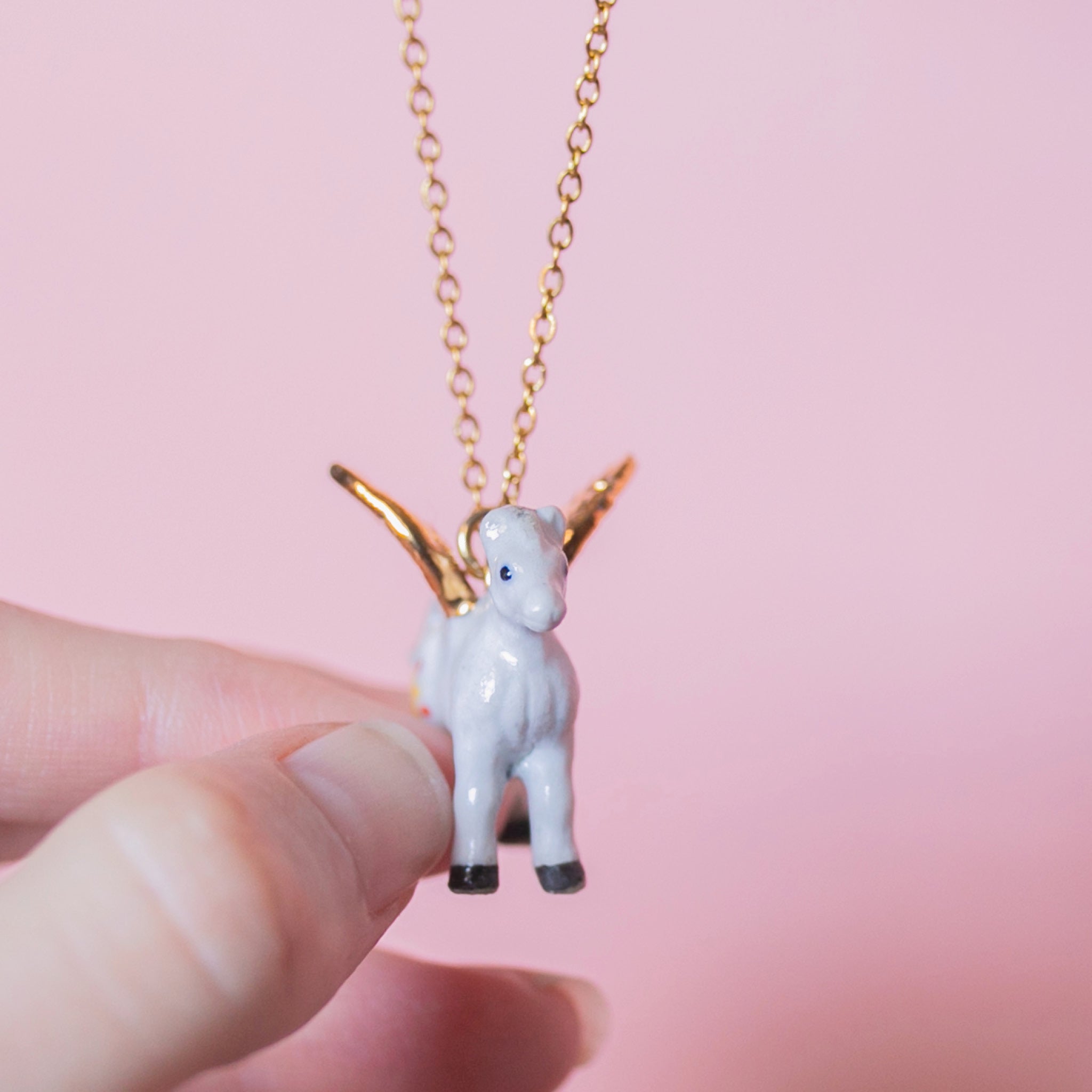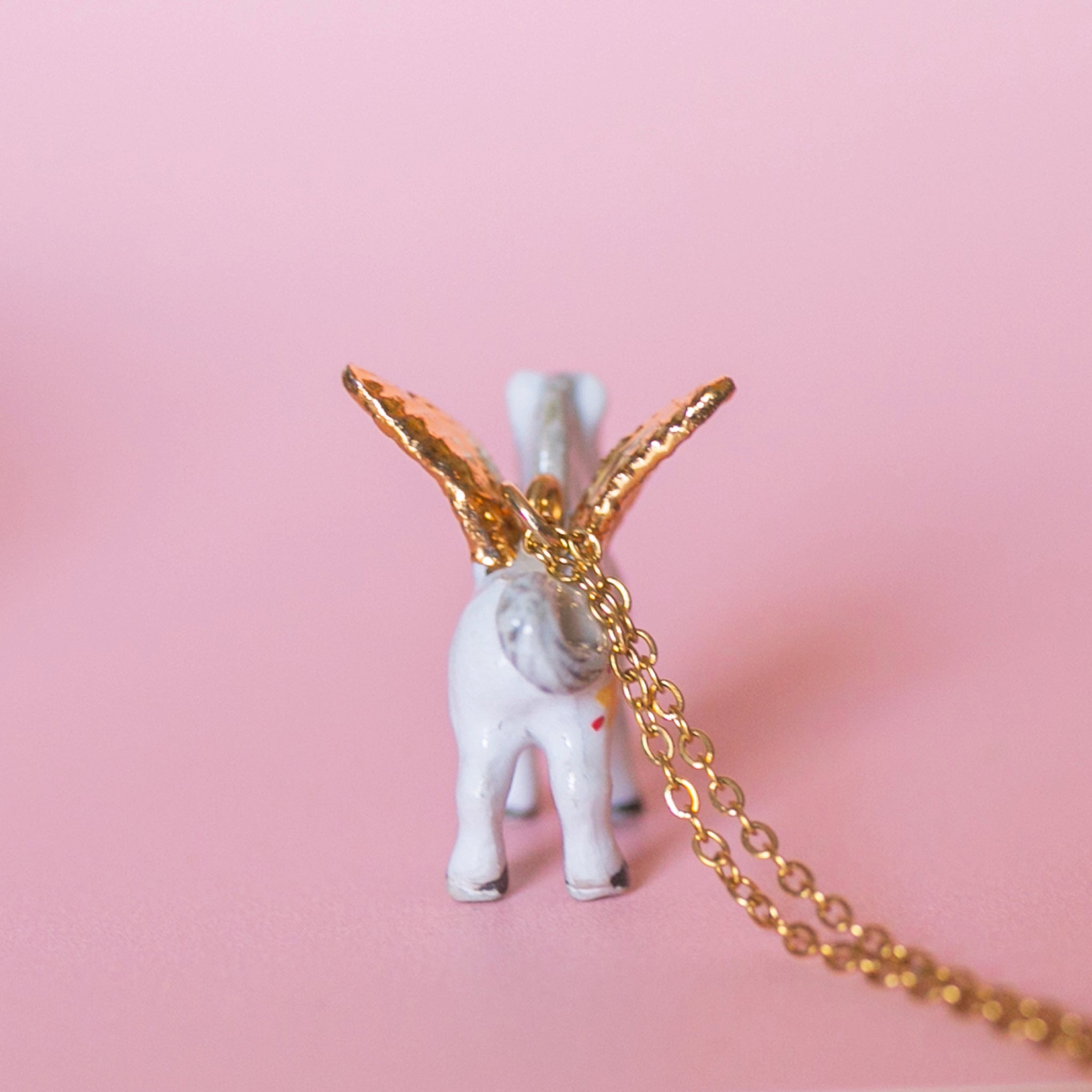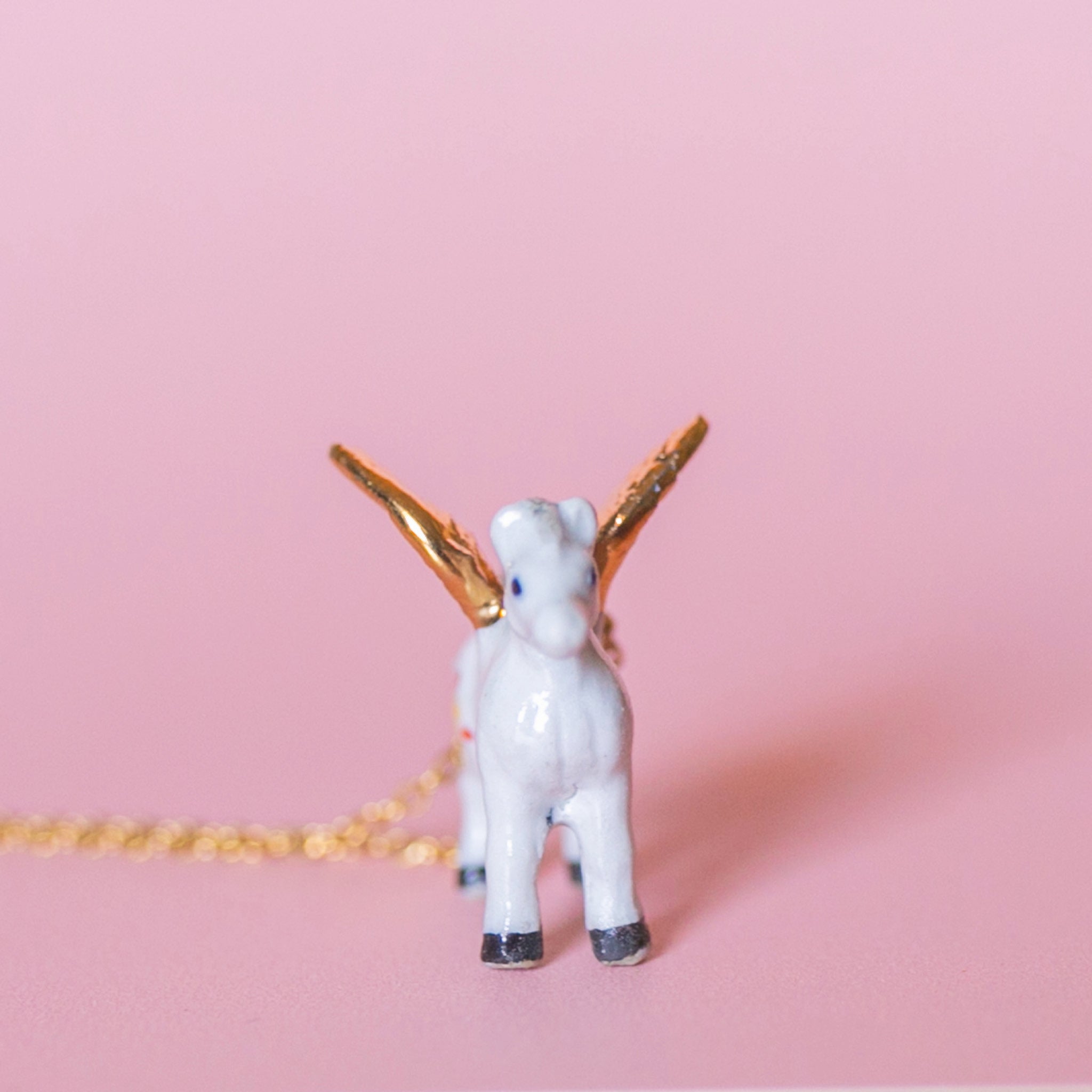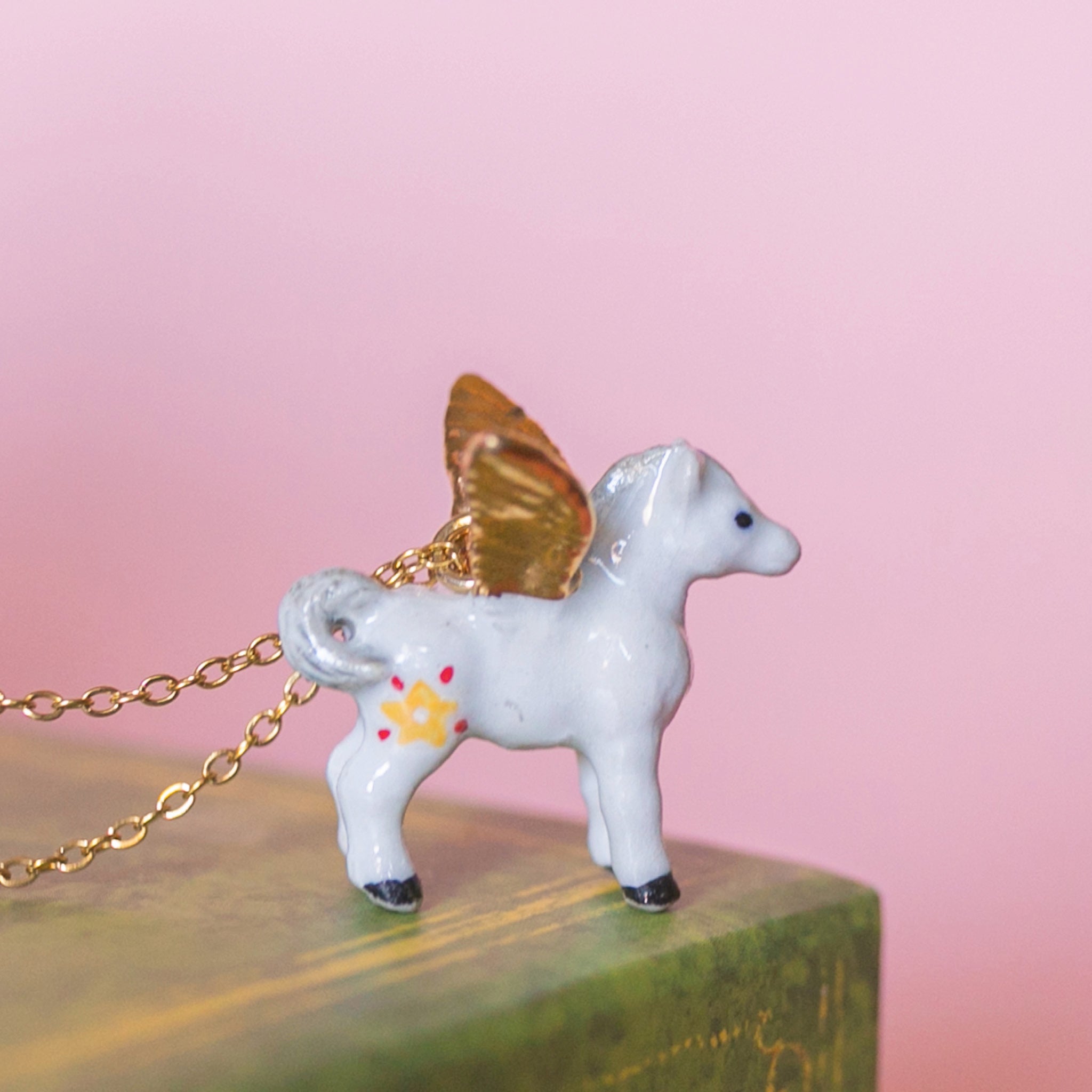 From the world of myths and magic comes the divine winged horse known as the Pegasus. Camp Hollow's rendering of this Grecian fabled flyer is rendered from porcelain and hand-painted to perfection. In this special edition version, the Pegasus' majestic wings have been given the touch of gold treatment, making them as glowy and gorgeous as a sunset. The Gold Pegasus flies on a 24 inch 24k gold steel chain, comes in comes individually gift boxed, and ships for free in the US!