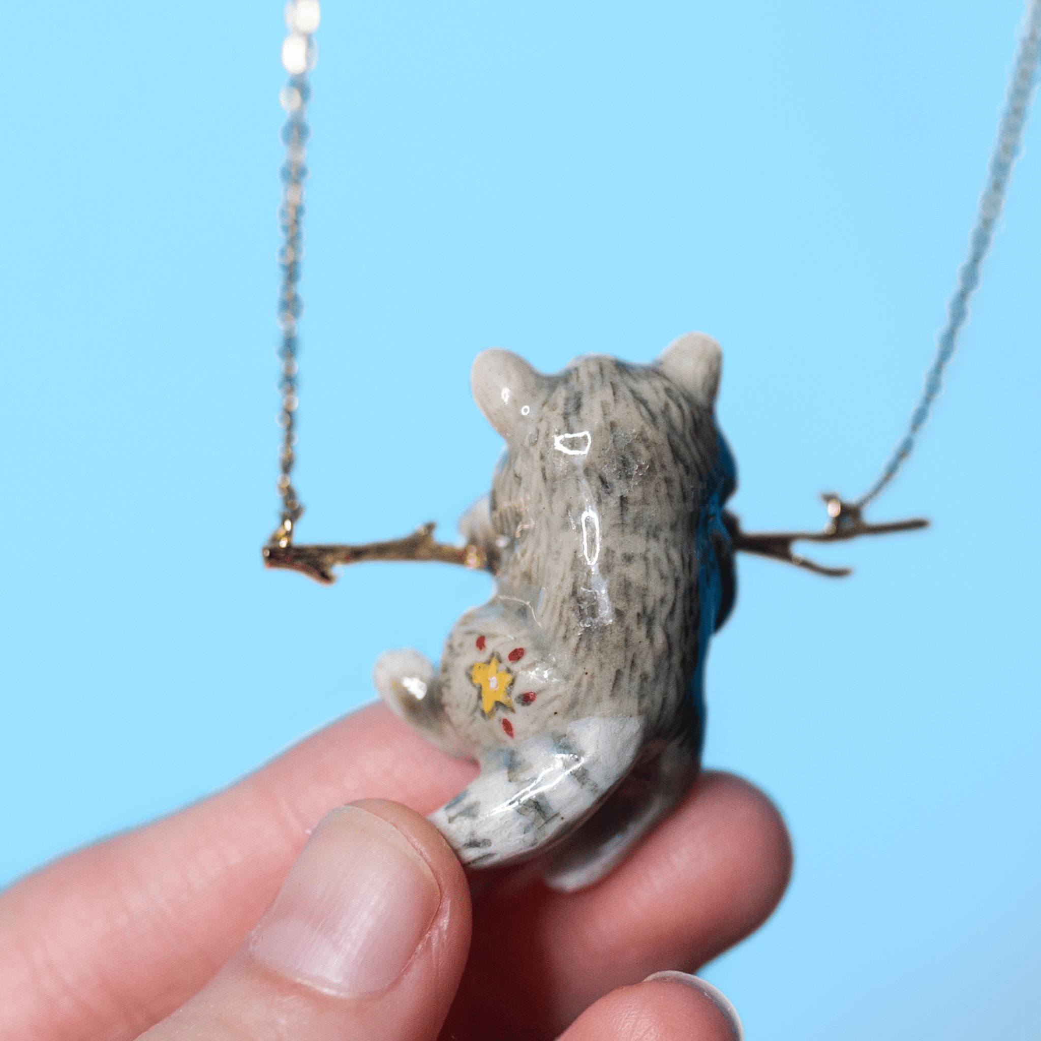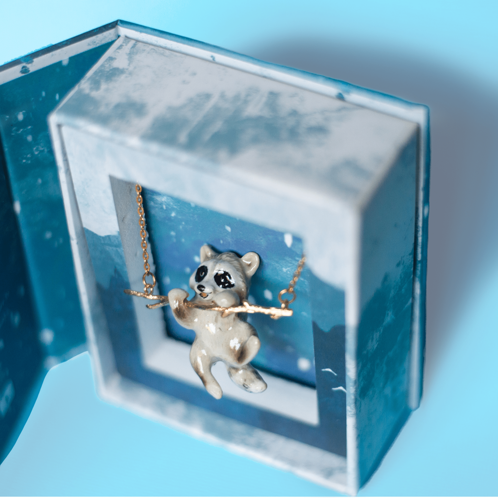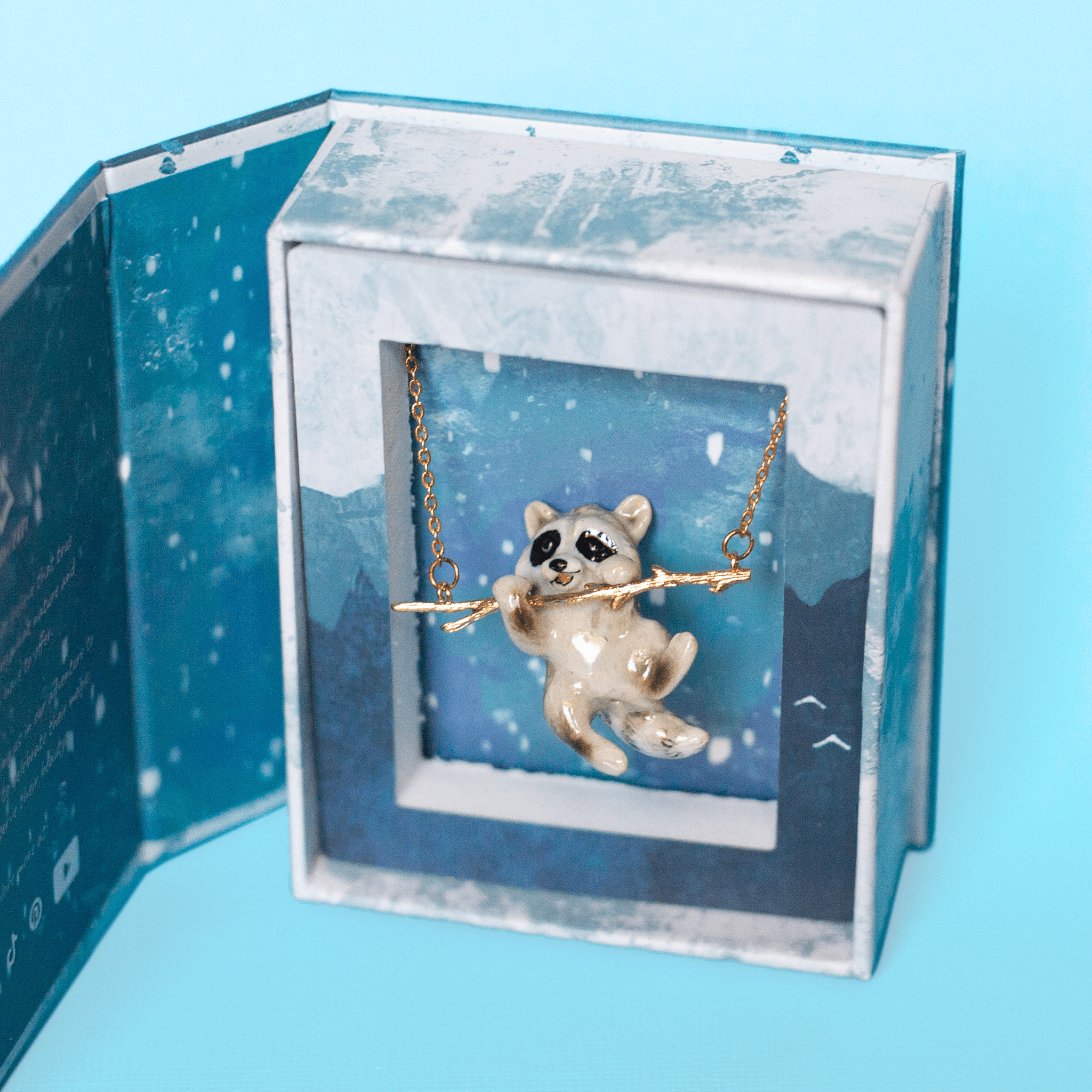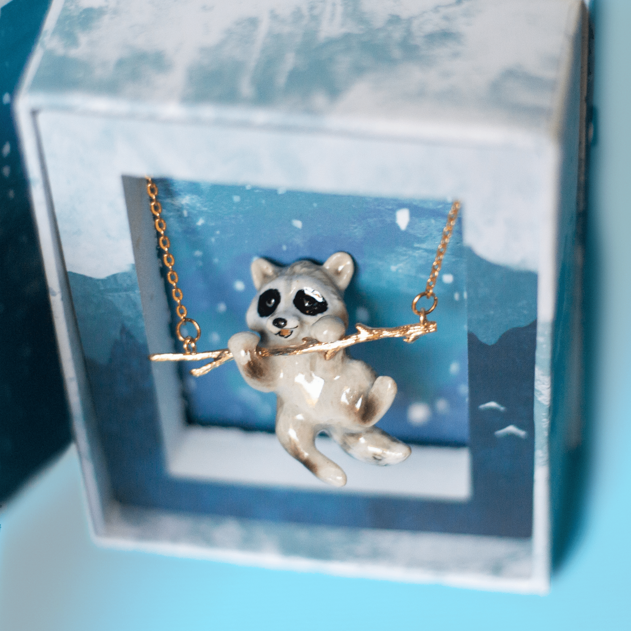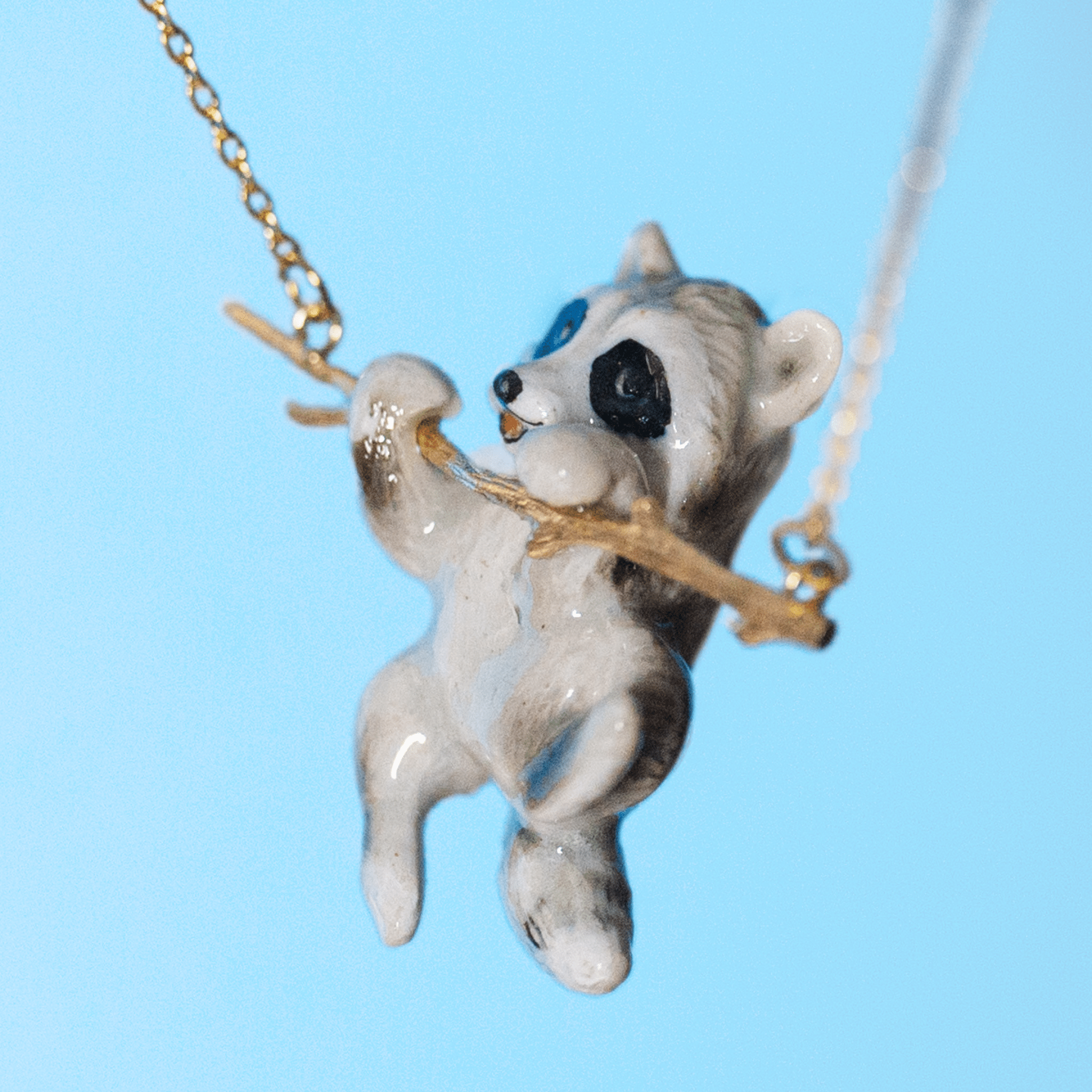 The Raccoon Necklace, features a one-of-a-kind hand-painted porcelain pendant hanging from a beautiful gold-steel chain. This little raccoon, with its adorable mask and bushy tail, was voted the Cutest In All The Land by our Camp Hollow community! But it's not just looks that make this raccoon special-- often referred to as "masked bandits" or "trash pandas," raccoons are known for their intelligence and resourcefulness. They are truly fascinating creatures, and this piece is a celebration of the beauty and wonder of these adorable little creatures. And as a special gift to our loyal customers, it is now on sale! Treat yourself or a loved one to the magic of the Rascal Raccoon necklace. π¦πΎπ
