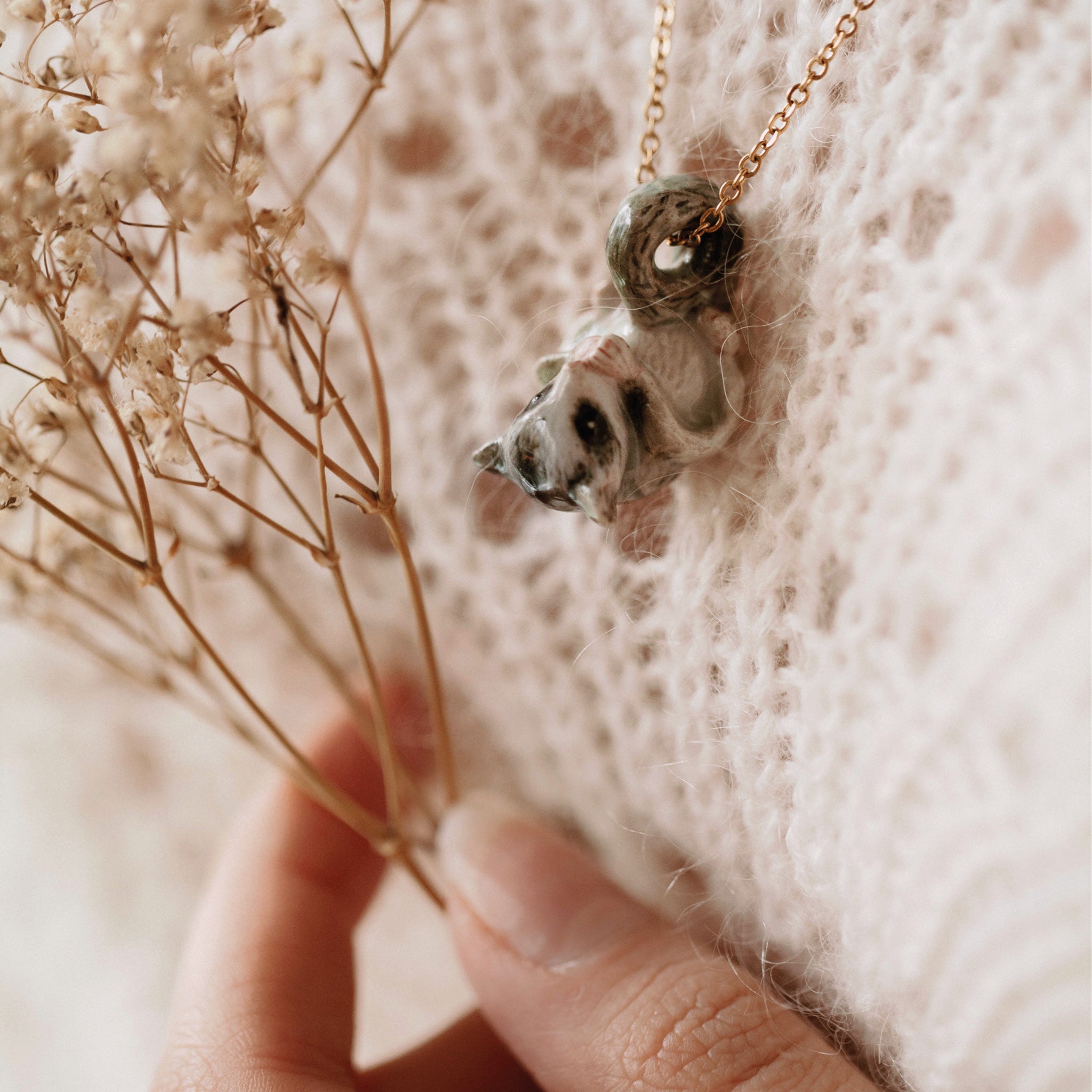 Introducing the The Dreamy Sugar Glider necklace, a truly unique and enchanting piece of jewelry that will transport you to a world of magic and wonder. The porcelain sugar glider figurine is meticulously hand-painted and hangs gracefully from a delicate gold plated steel chain, as if suspended in midair.