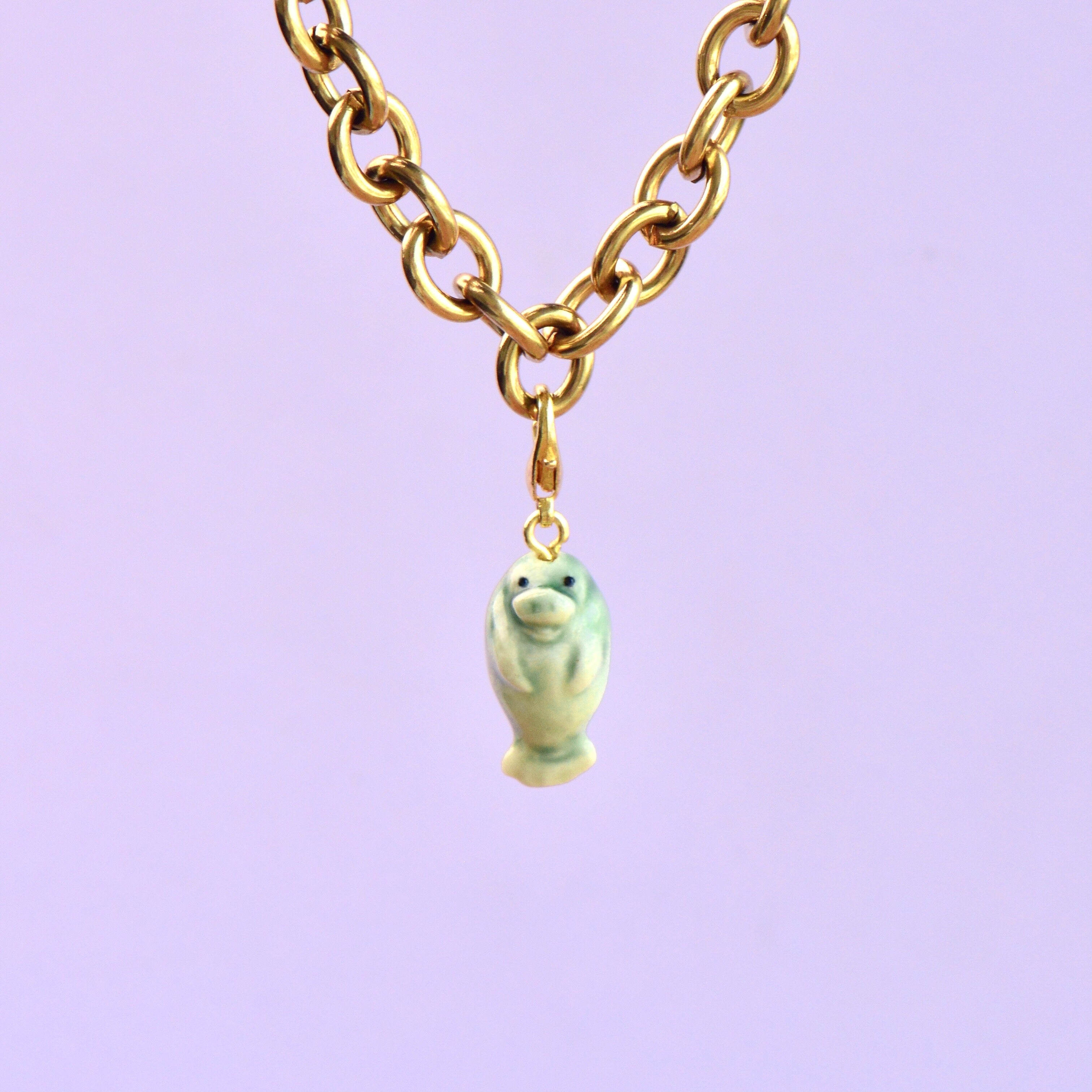 The gentle manatee-- the big, adorable, slow-moving marine mammal we all know and love-- has finally made its way to Camp Hollow! Our tiny manatee charm comes on a gold steel clasp and is ready to hang around from any necklace or charm bracelet, just taking it easy 💤